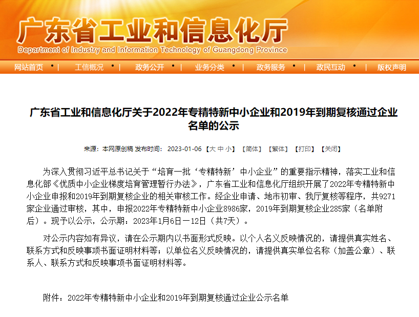 為深入貫徹習(xí)近平總書記關(guān)于“培育一批‘專精特新’中小企業(yè)”的重要指示精神,落實工業(yè)和信息化部《優(yōu)質(zhì)中小企業(yè)梯度培育管理暫行辦法》,廣東省工業(yè)和信息化廳于2022年8月組織開展了2022年專精特新中小企業(yè)申報和2019年到期復(fù)核企業(yè)的相關(guān)審核工作。經(jīng)企業(yè)申請、地市初審、我廳復(fù)核等程序,于2023年1月6日公示名單。