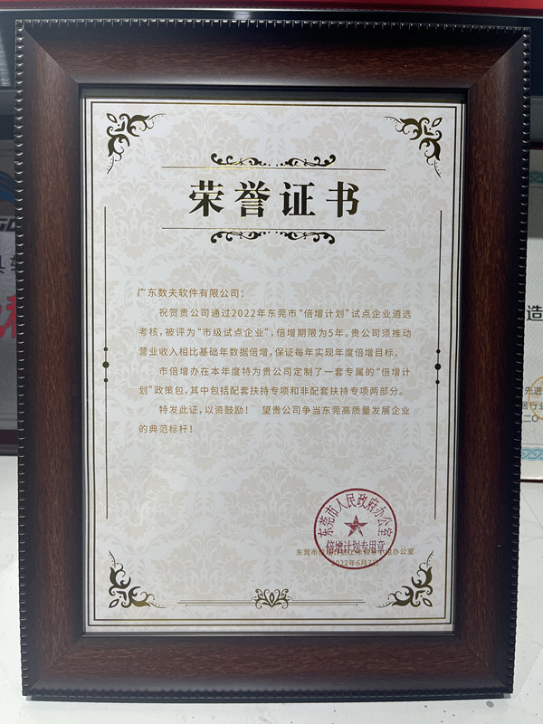 數(shù)夫軟件被評(píng)為東莞“倍增計(jì)劃”市級(jí)試點(diǎn)企業(yè)