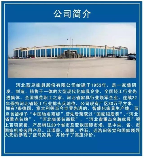 從1953年建廠以來,每一年都有新的故事、每一年都有新的變化,而“藍鳥”這個同中國一起強大起來的品牌,不僅僅是邢臺市的一張名片、不僅僅是河北省的一張名片——自“藍鳥”第一件家具出口,它便是飛向世界的品牌,是“中國”的名片!