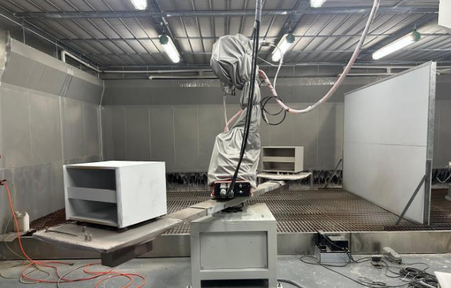 機(jī)械臂不停揮舞,噴槍內(nèi)的水性漆正對(duì)家具進(jìn)行...